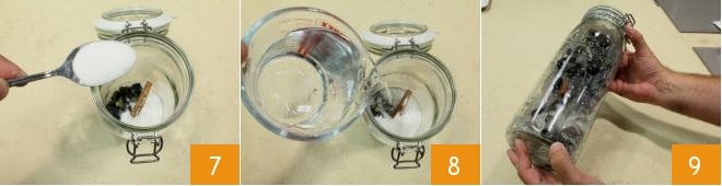 add 5 oz of sugar 7, then cover with the alcohol 8. Seal the jar tightly and shake well to dissolve the sugar 9.