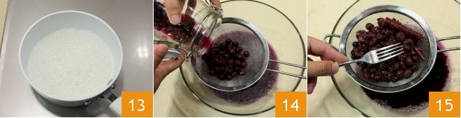 boil for 2 minutes 13 and then turn off the heat, allowing the syrup to cool. Meanwhile, strain the contents of the glass jar through a fine-mesh sieve 14, pressing the strawberry grapes well to extract all the juice 15;