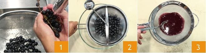 To make the strawberry grape risotto, first remove the grape berries and rinse them thoroughly under running water 2, pass the berries through a food mill 2, keeping some aside for garnishing the dish, then strain the mixture through a sieve 3