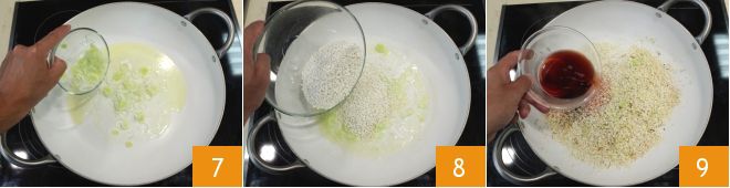 and then add the previously sliced leek 7, sauté for a few minutes, then add the rice and toast it for a few minutes, stirring continuously, deglaze with a glass of red wine and let it evaporate.
