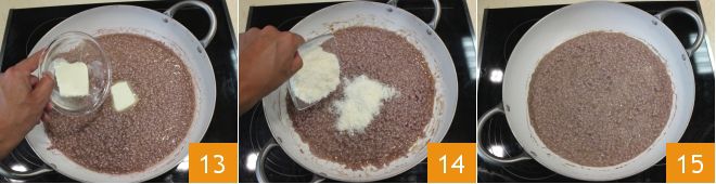Once cooking is finished, adjust the salt, remove the pan from the heat and stir the risotto with the remaining butter 13 and grated Grana Padano PDO 14; Your strawberry grape risotto is ready 15, serve it hot garnishing with some strawberry grape berries.