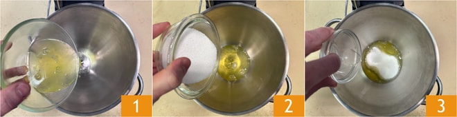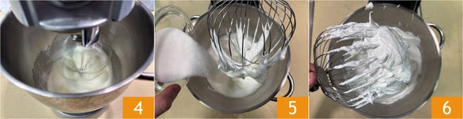 Turn the mixer on medium speed, and when the meringue begins to be well whipped 4, add the remaining half of the sugar 5. Continue to whip until you get a thick, shiny, and frothy mixture 6.