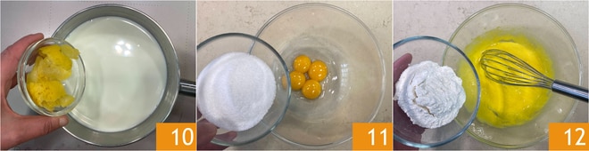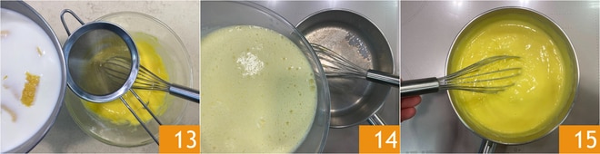 In the meantime, prepare the custard: heat the milk in a saucepan with the addition of lemon zest 10. In a separate bowl, pour the egg yolks and sugar 11, then mix with a whisk. Once well combined, add the cornstarch and rice starch 12.