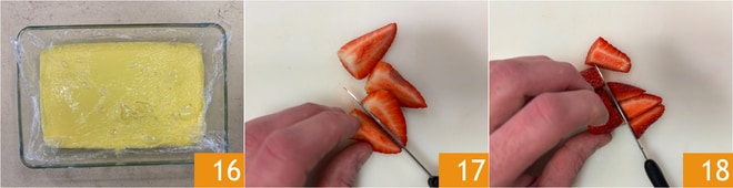 Once thickened, transfer the custard to a baking dish, cover with plastic wrap in contact with the surface, and let it cool first at room temperature and then in the refrigerator for at least 3 hours 16. After cooling, focus on the strawberries: trim and cut about 1 cup into wedges 17 and 1 cup into cubes 18.