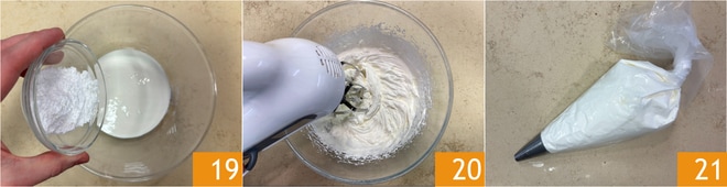 Lastly, prepare the whipped cream: pour the cream and powdered sugar into a bowl 19, then whip with electric beaters 20 and transfer it to a piping bag with a plain nozzle 21.