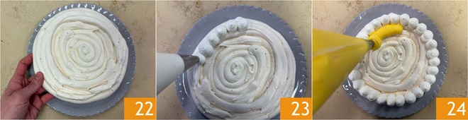 You are ready to assemble the cake: place the first meringue disk on a serving plate 22, then decorate the edge with dollops of whipped cream 23. Take the custard from the fridge, soften it with a whisk, then fill the center using a piping bag 24.