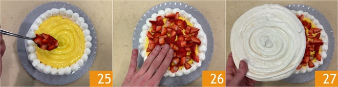 Spread the cubed strawberries over the custard 25 and gently press with your hands to level them 26, then cover with the second meringue disk 27.