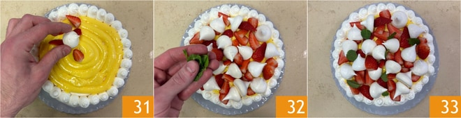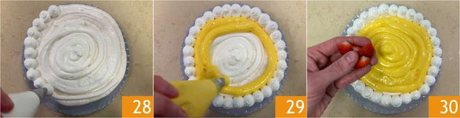 Decorate the edge with more dollops of whipped cream 28 and fill the center with custard 29. Now garnish the surface with strawberry wedges 30.