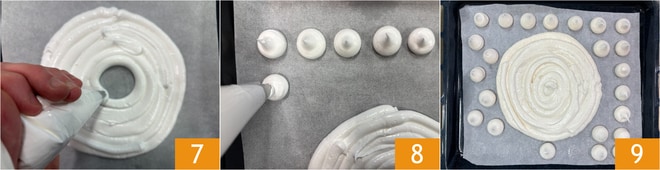 Transfer the meringue to a piping bag with a plain nozzle and draw a circle with a diameter of 8 inches on a baking sheet lined with parchment paper. Create a meringue disk by forming concentric circles from the outside to the center 7, then do the same to make a second meringue disk. With the remaining mixture, pipe small meringues onto the baking sheet; you will use these for decoration 8. Bake in a preheated static oven at 194°F for at least 4 hours or until the meringue is dry and crispy 9. Once baked, turn off the oven and let the meringues cool inside.