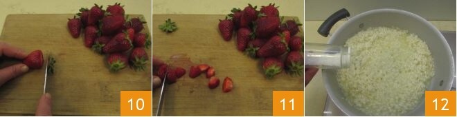 While the rice is cooking, wash the strawberries, remove the stems with the leaves 10, and cut them into pieces 11. Once the risotto is ready, add salt 12 and turn off the heat.
