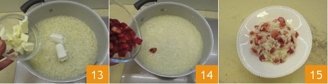 With the heat off, stir in the goat cheese and butter 13, mix well to melt them, and finally add the strawberry pieces 14. Mix the strawberries well and serve the strawberry risotto hot 15.