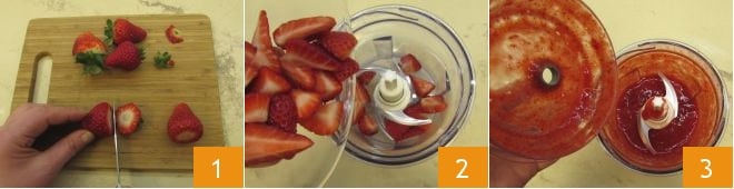 To make the strawberry semifreddo, start by washing the strawberries: remove the hulls and cut them into small pieces. Pour the strawberries into a food processor with blades 2, and blend until you obtain a smooth puree 3