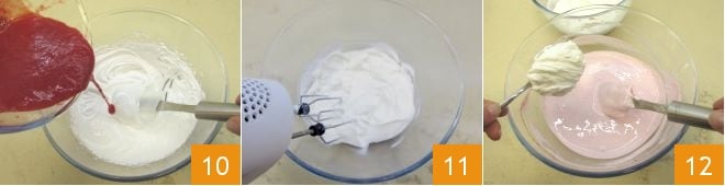 At this point, pour in the strawberry puree 10 and mix well with a spatula to combine the two mixtures. Separately, in another bowl, whip the fresh cream (to whip it well, the cream should be very cold, as should the bowl and beaters) 11 and, once ready, incorporate it into the strawberry mixture 12