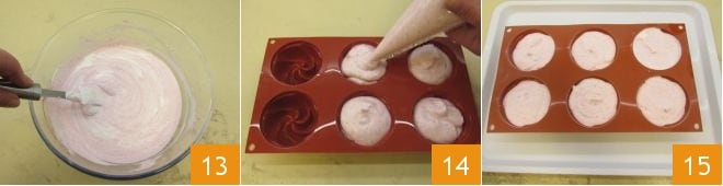 stirring very gently from bottom to top 13. Then transfer the mixture into a disposable piping bag without a nozzle 14 and fill two silicone molds for 6 desserts with a capacity of 2.6 oz each, with a diameter of about 3 inches and a height of about 1.5 inches 15. Gently tap the mold on a work surface to better distribute the mixture inside the individual molds and let it set in the freezer for about 12 hours.