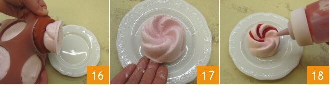 After 12 hours, take your mold, unmold the dessert by turning the semifreddo directly onto the serving plate (16-17). Now take the 2 oz of strawberry puree you set aside, pour it into a pastry bottle, and decorate the semifreddos by distributing the puree within the streaks of the semifreddo to create a floral pattern 18. Your strawberry semifreddo is ready to be served!
