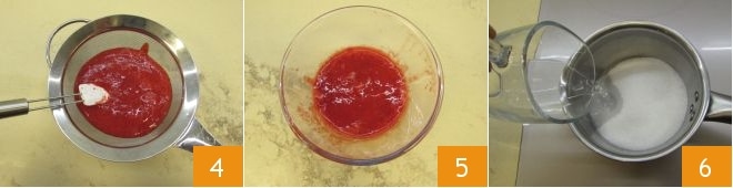 Sift the puree to remove the seeds 4 and collect it in a bowl. Set aside about 2 oz of the obtained puree 5 for the final garnish, making sure to keep it covered with plastic wrap in the refrigerator. Now prepare the syrup: in a thick-bottomed saucepan, pour the granulated sugar, add the water 6, and heat over low heat to dissolve the sugar. When the syrup begins to boil, immerse a food thermometer to ensure it reaches 250°F.
