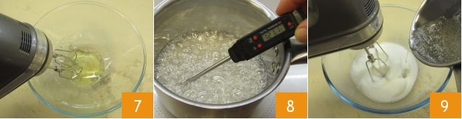 When the syrup reaches 237°F, start beating the egg whites with electric beaters 7; once the syrup has reached 250°F 8, pour it slowly into the bowl with the beaters running 9 and continue to beat until you get a frothy mixture.