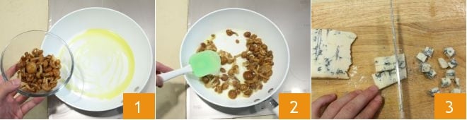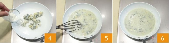 place 8.8 oz of gorgonzola in a pan and add the milk 4, melt the cheese over moderate heat, stirring with a whisk 5 until a smooth cream is obtained, then turn off the heat and set aside 6.