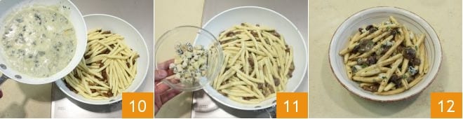 incorporate the gorgonzola cream 10 and stir with a spoon to flavor, heating over low heat. When the ingredients are combined, turn off the heat and garnish with the remaining gorgonzola cubes 11 and scent the dish with fresh thyme leaves. Your strozzapreti with mushrooms and gorgonzola are ready, enjoy them hot 12!