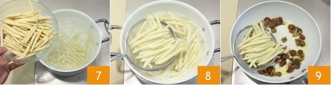 Cook the strozzapreti in plenty of salted water to taste, for the time indicated on the package 7. When the pasta is al dente, drain it with a slotted spoon 8 and pour it directly into the pan with the mushrooms 9,