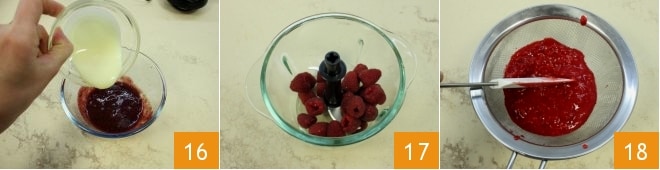 Pour 1.4 oz of condensed milk into the sauce 16 and mix to combine the mixture. Proceed in the same way with the raspberries: blend them in the blender 17, pass the mixture through a sieve 18