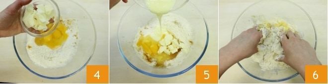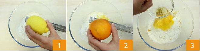 To make the cream-covered struffoli, start with the dough: place the sifted flour in a bowl, grate the lemon zest 1 and the orange zest 2. Then add the eggs to the center 3,