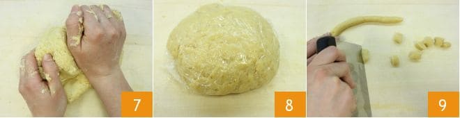 Knead vigorously (6-7) and, once you have a homogeneous and fairly compact mixture, shape it into a ball and cover it with plastic wrap 8, let it rest for at least half an hour. After the resting time, work the dough again for a few minutes and divide it into many sticks less than a finger thick, rolling them on a slightly floured surface. At this point, cut the sticks into small pieces 9 and place them on a cloth, being careful not to overlap them.