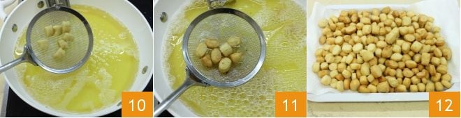 Once ready, put the oil in a pan and fry your struffoli a little at a time 10; for optimal cooking the oil should be about 340°F-355°F. When the struffoli appear puffed and golden 11 but not particularly colored to prevent them from burning, drain them and let them cool on paper towels 12.