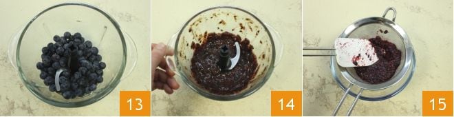 Now take care of the creams: put the blueberries in the blender cup 13 and blend them 14, pass the obtained mixture through a sieve to obtain a smooth sauce 15.