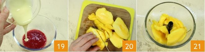 and then incorporate 1.4 oz of condensed milk 19. Finally, prepare the mango cream: cut the fruit into wedges 20, blend it in the blender 21