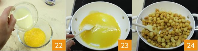 and add 1.4 oz of condensed milk here too 22. Now prepare the caramel to coat the struffoli: heat the honey in a pan over low heat until you get a smooth sauce 23,