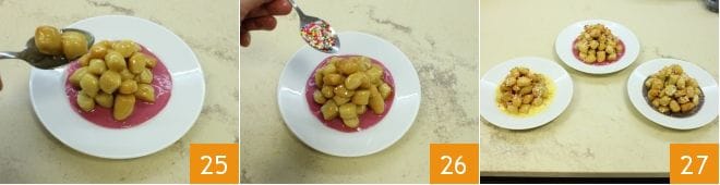 pour the struffoli and mix to combine the syrup 24. At this point, you can assemble the dish: pour the 3 sauces onto 3 different plates, place the struffoli on top 25, and finally garnish the surface with colorful sprinkles 26. Your struffoli with milk creams are ready to be enjoyed!