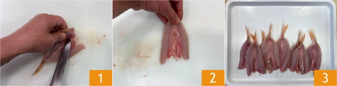 To prepare the stuffed and fried red mullets, start by cleaning them: remove the head, cut open the belly, then remove the entrails under running water. Place the mullets on the cutting board and make a cut along the entire length 1, without completely dividing the fillets. Remove the central bone and open them like a book 2. Perform this operation for all the mullets and set them aside 3.