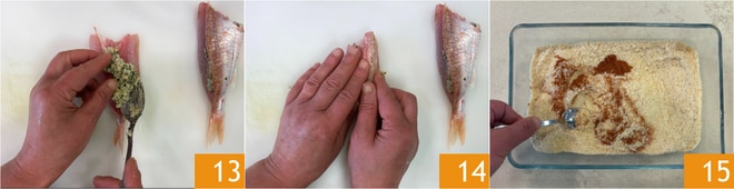 Stuff each mullet with a teaspoon of filling 13 and close it on itself without pressing too much 14. In a large bowl, pour the breadcrumbs, season with sweet paprika, and mix to obtain a homogeneous breading 15.