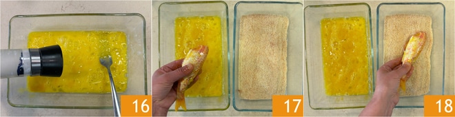 In another shallow and wide bowl, break the eggs and beat them, season with salt 16. Place a pan with plenty of seed oil on the stove and heat it to 338°F (preferably using a kitchen thermometer). Dip the mullets, one at a time, first in the beaten eggs 17 and then in the breadcrumbs 18 to coat them well on all sides.