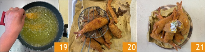 Once ready, take a few at a time to fry them in the oil which has reached the temperature 19. When they are well golden, drain them with a slotted spoon and place them on paper for frying 20. Salt to taste. Your stuffed and fried red mullets are ready to be served 21.