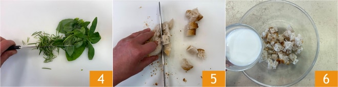 Prepare the filling: chop the aromatic herbs 4, then cut the bread into cubes, place it in a bowl 5 and soak it in milk 6. Work it with a wooden spoon until it becomes completely soft.
