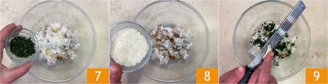 To the soaked bread, subsequently add the chopped aromatic herbs 7, the grated pecorino cheese 8, and a grated clove of garlic 9.
