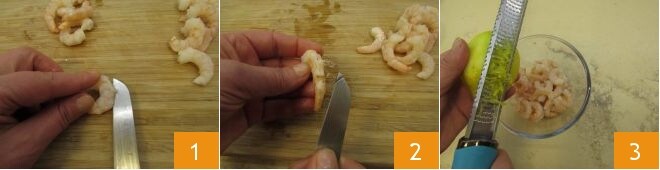To prepare the stuffed avocado, start with marinating the shrimp. First, make an incision along the back with a blade 1 and use it to remove the intestine, which is the black and bitter filament inside 2. Place the shrimp in a container and add flavor by grating the zest of half a lemon 3.