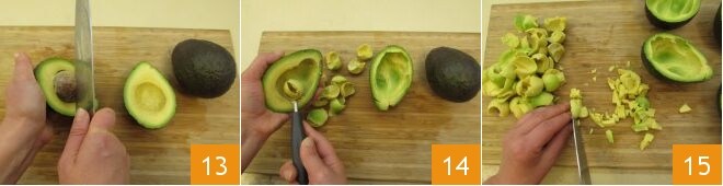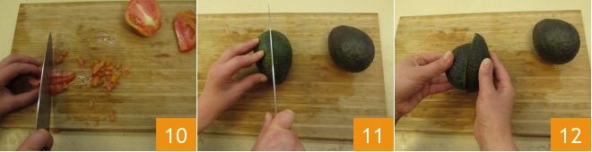 Wash and dry the oxheart tomatoes, slice them, and then cut them into cubes about 1 cm (0.39 inches) in size and set them aside 10. Move on to cutting the avocados, making a lengthwise incision with a blade 11 and then separating the two halves by simply twisting your hands in opposite directions 12.