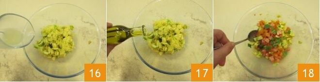 Add the lemon zest and juice to prevent it from oxidizing 16, drizzle with oil 17, and finally add the tomato cubes along with a pinch of salt and pepper and the chopped mint 18. Mix everything and set aside for a moment.