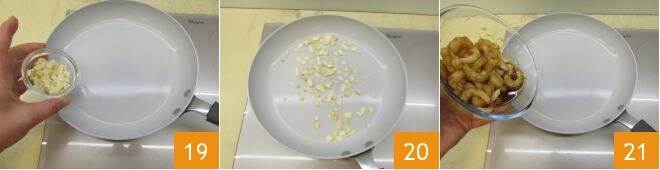 In a pan, place the almond slices 19 and toast them for a couple of minutes on high heat, stirring often to prevent burning 20. Finally, take the shrimp and place them in another pan 21.