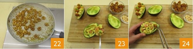 Cook them on high heat for 1 minute 22. Begin filling the avocados with the mixture 23 then garnish with 4 shrimp per piece 24.