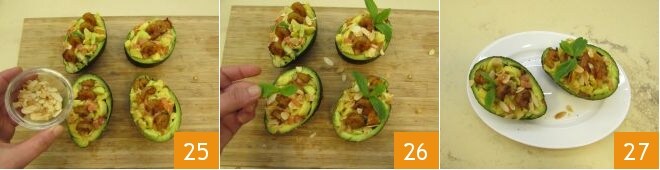 the almond slices 25, a sprig of mint 26, and your stuffed avocado is ready, repeat for all the others. Serve your stuffed avocado immediately 27!