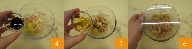 Then pour in the soy sauce 4 and honey 5, briefly mix with a spoon, and finally cover with plastic wrap and let it rest for 30 minutes in the refrigerator 6.