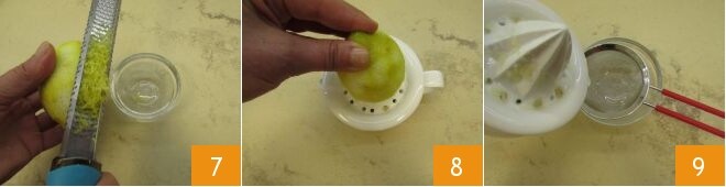 In the meantime, prepare the filling. Grate the zest of the other half of the lemon and collect it in a small container 7, then squeeze the juice 8 and strain it to remove any pulp and seeds 9.