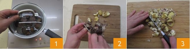 To prepare the stuffed cockerel in fruit sauce, start with the chestnuts. Boil them for about 30 minutes with the lid on 1, and as soon as they are cooked, drain them and remove both the shell and the skin 2. Finally, chop only 50 grams of them, while you can keep the rest whole 3.
