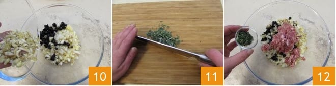 then add the prunes and chestnuts 10. Chop the bay leaf, sage leaves, and rosemary needles 11 and add them to the mixture along with the sausages, making sure to save a little of the chopped herbs to rub on the surface of the chickens 12.