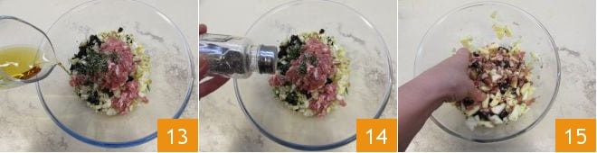 Finally, pour in the brandy 13, adjust the salt and pepper 14, and mix everything well with your hands, or with a spoon if you prefer 15, and set aside the mixture which will be used for stuffing.