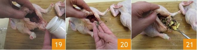 Salt and pepper the surface and inside of the chickens 19, add a little of the aromatic chop 20 and stuff them with the previously prepared filling 21.